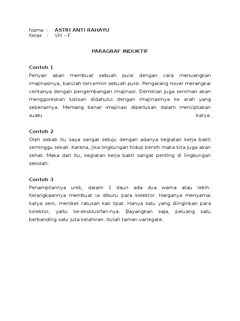 Contoh Paragraf Deduktif Induktif Menurut letak kalimat utama atau gagasan pokoknya paragraf terbagi menjadi paragraf deduktif dan paragraf induktif. Buatlah contoh paragraf induktif Dan deduktif - Brainlycoid 12 Mar 2015. Tidak hanya contohnya saja yang akan kita sajikan melainkan juga pengertian ciri-ciri dan jenis dari 3 paragraf ini.