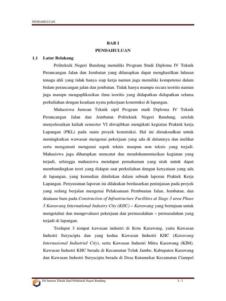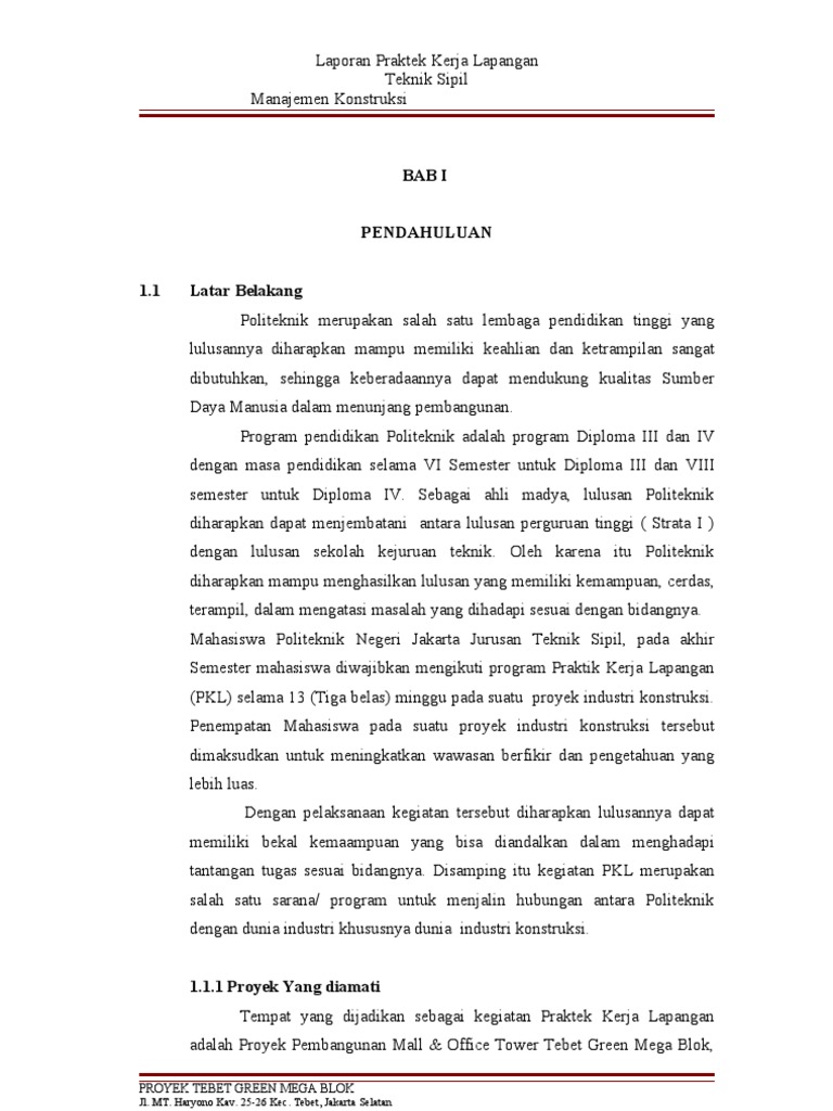 Contoh pendahuluan laporan pkl teknik sipil. TINJAUAN UMUM PROYEK Yang dimaksud dengan tinjauan umum disini adalah pengamatan mengenai gambaran umum dari proyek tersebut. LAPORAN PRAKTEK KERJA LAPANGAN PKL TEKNIK SIPIL BAB I. Jurusan Teknik Sipil 5 POLITEKNIK NEGERI MEDAN Laporan Praktik Kerja Lapangan Jurusan Teknik Sipil 6 POLITEKNIK NEGERI MEDAN Laporan Praktik Kerja Lapangan BAB II PELAKSANAAN PKL A.