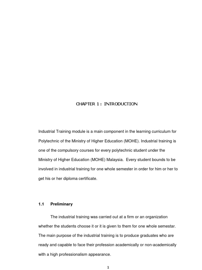 Industrial training is a formal practical which is conducted in a company that provides an industrial environment to the student. Only one chapter is allocated for this report. Tentatively before or by 28 SEPTEMBER 2015 st.