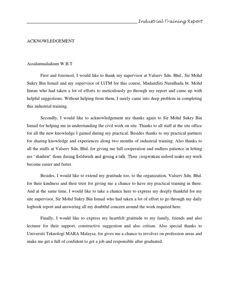 INDUSTRIAL TRAINING REPORT Cover page See the Example 1 Table of Contents See the Example 2 Only starting page numbers should be included. Industrial training is one of the requirements for the award of degree of Bachelor of Engineering Hons Mechanicalknown as EM220 by the Faculty of Mechanical Engineering Universiti Teknologi MARA UiTM. It is a requirement to fulfil the course in order to complete the degree as well as graduate from the university.