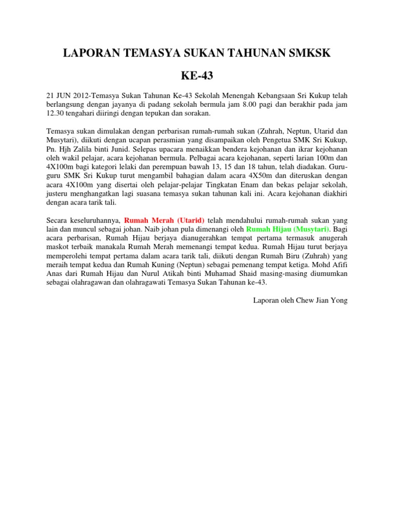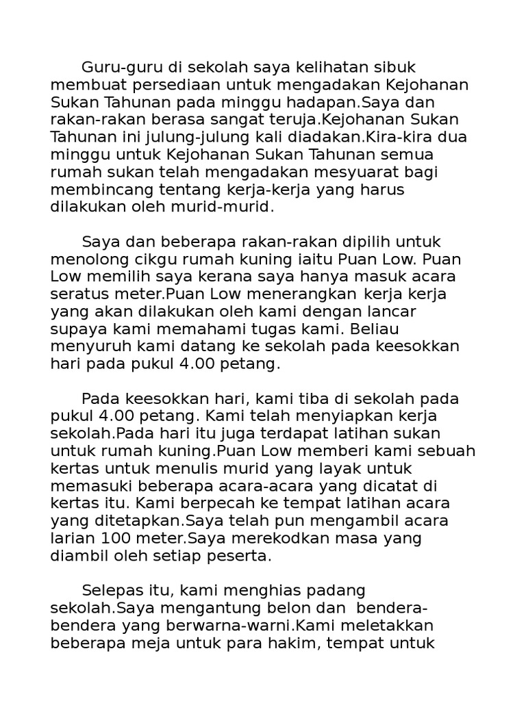 Temasya sukan sekolah saya pada hari ahad yang lepassekolah saya telah mengadakan temasya sukan tahunansukan tahunan tersebut diadakan di padang sekolah saya yang luas itu. Contoh karangan laporan lawatan sambil belajar ke langkawi via worldglobeshere format dan contoh penulisan esei berformat via slideshare 100 karangan contoh pmr dan spm by zaiton zaba issuu via issuu cikgu rohani. Rumah-rumah sukan itu ialah Rumah Bendahara Rumah Laksamana Rumah Temenggung dan Rumah Shahbandar.